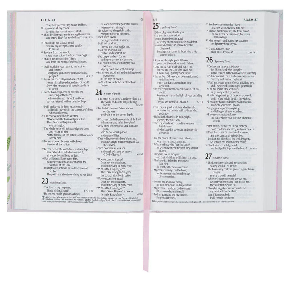 This delightfully pretty Bible features an embossed front cover. The whimsical floral illustration with deer and little birds wraps around to the back cover. Here, you'll also find a bunny, and an encouraging Bible verse printed in teal lettering.