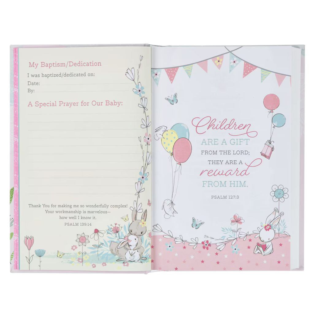 This keepsake Bible uses the entire NLT text, a translation that is written in a modern, easy-to-understand language. In addition, 32 charming full-color pages are illustrated with heartfelt prayers, beloved hymns, and memorable Bible verses. Brimming with charm, these pages will delight your daughter when she is old enough to read.