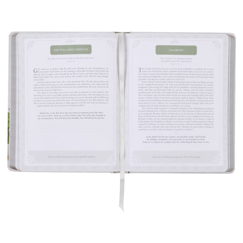 Each of the 365 daily entries features a date, title, Bible verse, and devotional thought. Each entry ends with a blessing, and a prayer.